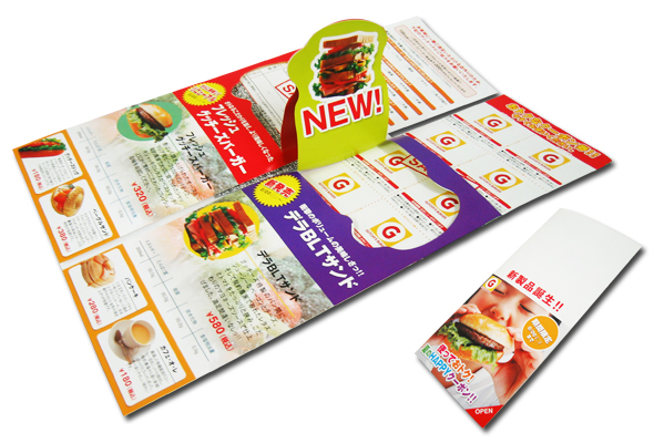 - リーフレットを開くと、中からポップアップ!!クローズアップしたい情報をハッキリと訴求できます。さらに内側に2種類のカードが封入されます。目を引く面白いギミックで訴求ができます。2点の封入物の使い方はニーズに合わせて