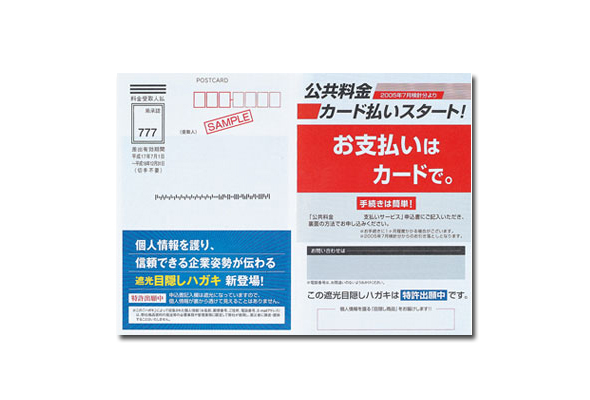 金融機関の口座名やクレジットカード番号の記入が必要なハガキには、この遮光性目隠しが最適です。試作品を用いたヒアリング調査では、主に金融関連の企業各社からの反響がよく、既に大手クレジットカード会社のガス料金決済手続のためのハガキとして採用されています。