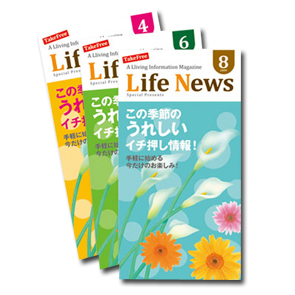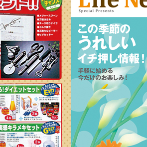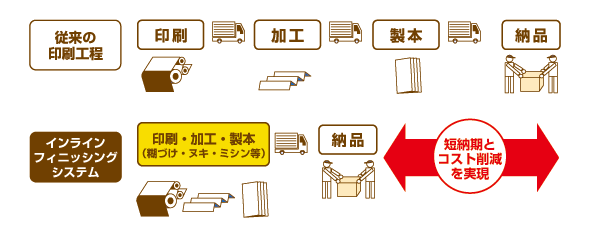 - 期的なインライン技術(オフセット輪転機にグルー装置を装備し、トリマー加工機"三方断裁機"を配置する技術)により、高速印刷と製本を同時に行うことが可能なことから、B5サイズで16ページの冊子が従来の冊子に比べて、約1/5の納期に短縮することが可能です。その分、商品選定や企画に時間をかけることができるため、よりタイムリーな情報をお届けすることができます。 また、2台の輪転機を連結(2in1システム)し、2枚重ねで印刷することによりB5サイズで24ページ、32ページの冊子、B3サイズで6ページ、8 ページの冊子の生産が可能となり、さらに、3台の輪転機を連結(3in1システム)することによって、B3で10ページ、12ページの冊子を生産することが可能です。また、フィニッシングシステムを使用することで、変形サイズの冊子が製本工程を通さずに生産できることから、大幅な納期短縮が実現できます。
